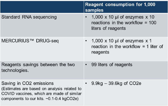Alongside single-use plastics, experimental reagents are also a major source of emissions. In our representative 1,000 sample example, we calculated that standard RNA-seq library prep methods use around 100 liters of reagents while MERCURIUS™ DRUG-seq uses only 1 liter, a saving of 99 liters (Table 1). Using emissions estimates from an analysis of COVID vaccines made with components similar to those in our kits, we estimate a saving of between 9.9 kg and 39.6 kg of CO2 (Table 1) (8).