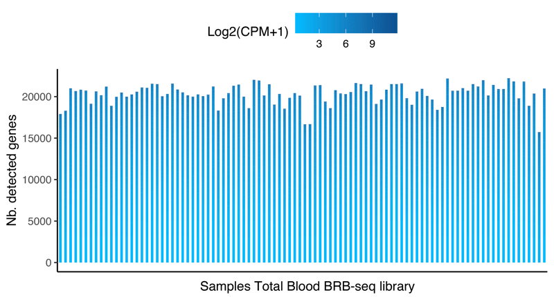 The recommend sequencing depth for the Total Blood BRB-seq libraries is between 2-10 M reads per sample, which is typically enough to detect the vast majority of expressed genes.