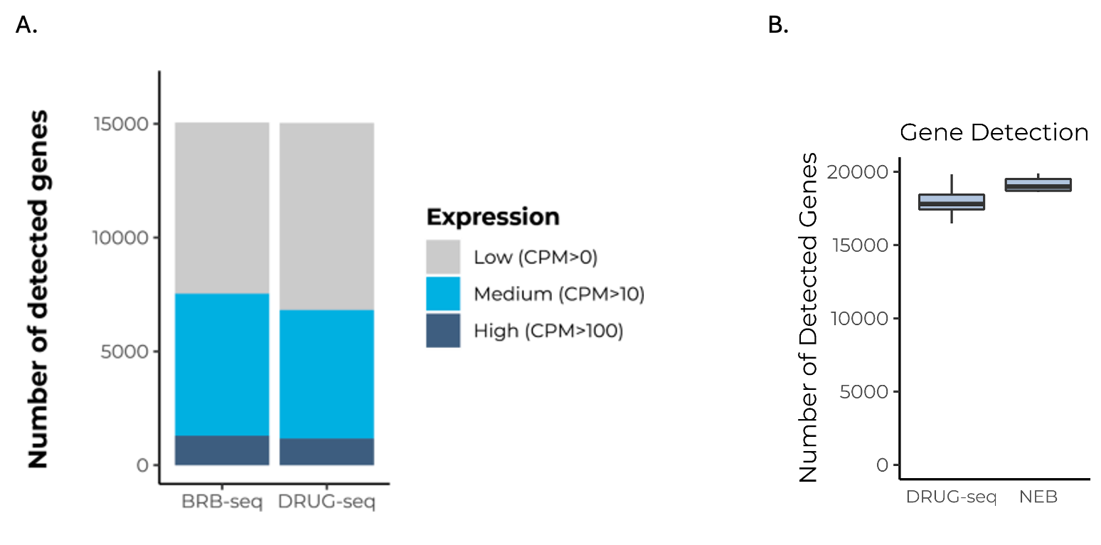 Commercialized MERCURIUS™ DRUG-seq has improved the published DRUG-seq protocol by avoiding bias-prone template switching and pre-amplification stages for a more sensitive and streamlined protocol that detects similar numbers of genes as BRB-seq (Fig. 3A) and NEBNext (Fig. 3B).