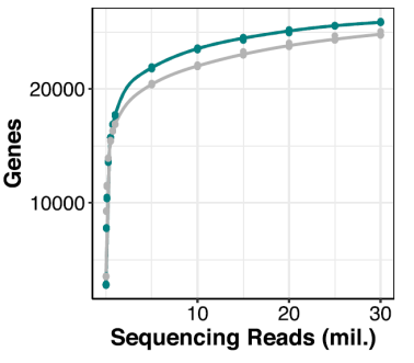 Figure 4. Benchmarking the number of genes detected with Prime-seq (green) against TruSeq (grey) at different sequencing depths. Modified from Janjic et al., 2022.
